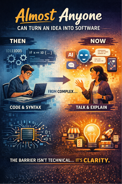 Instead of learning syntax, people can describe what they want in natural language. You can type it, prompt it, or talk to an AI system, and it will translate your intent into code, designs, or working software.